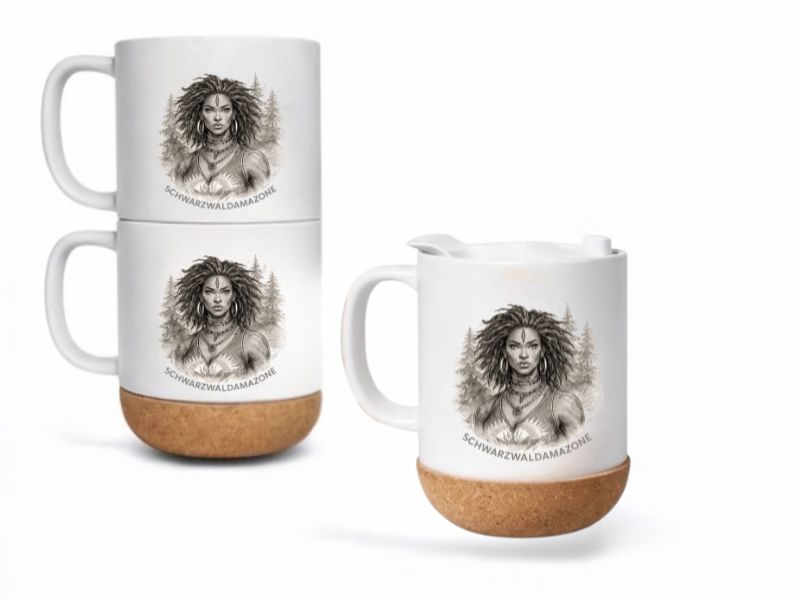 iese Tasse begleitet dich durch deinen Alltag, am Morgen, im Homeoffice oder draußen auf der Terrasse. Das Motiv verbindet den Schwarzwald mit der Kraft einer afrikanischen Frau. Zwei Welten. Ein Gedanke: Stärke.